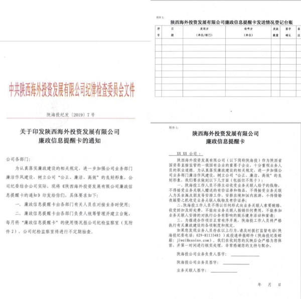 贯彻落实,廉洁意识入心。公司纪委结合再次征求的意见建议下发了《陕西海外投资发展有限公司关于廉政信息提醒卡的通知》(试行),公司各业务部门按要求进行对接,公司纪检监察室定期进行抽查。提醒卡公布了公司纪委监督举报电话,从而警醒公司业务人员及业务关联人增强纪律和规矩意识,自觉做到廉洁奉公、规避风险。
