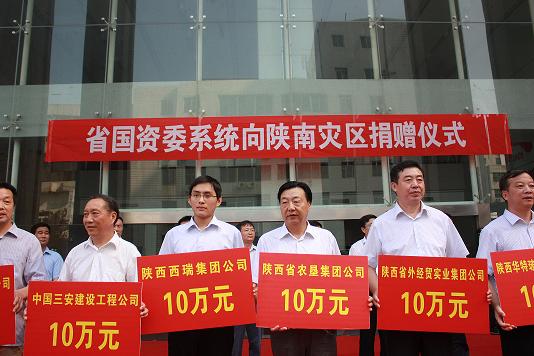 陕南灾区群众的情况深深的牵动着陕西省外经贸实业集团全体员工的心,8月4日早上,省国资委系统国有企业向陕南灾区捐款仪式在省国资委大楼前隆重举行,副省长姚引良、省国资委党委书记白阿莹出席了仪式。陕西省外经贸实业集团李凤成副总经理代表集团公司向陕南灾区捐款10万元,以实际行动支持陕南灾后恢复重建和突破发展工作。