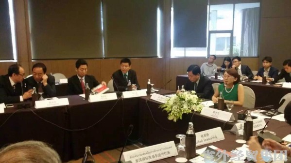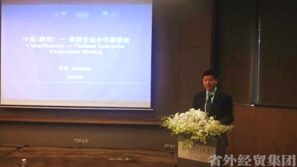 近日,中国(陕西)--泰国企业合作座谈会在泰国曼谷召开,集团公司董事长肖玉龙应邀参会。会上,肖玉龙董事长就集团公司和外经贸平台的相关业务向与会嘉宾作了推介发言,并与泰国中小企业协会、国际投资商会和泰国商务部亚洲司官员进行了商务合作会谈,建立了战略合作关系,为陕西和泰国企业进入对方市场牵线搭桥并提供综合服务。