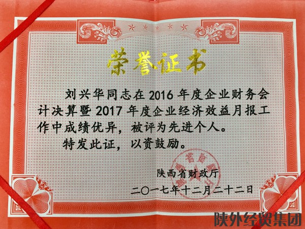 近日,集团公司在陕西省财政厅举办的2017年度财务决算布置会上荣获“陕西省2016年度企业财务会计决算及2017年度企业财务快报工作先进单位”称号,同时刘兴华同志荣获“陕西省2016年度企业财务会计决算及2017年度企业财务快报工作先进个人”。
