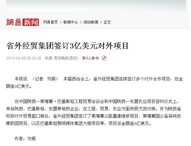 网易转载:省外经贸集团签订3亿美元对外项目