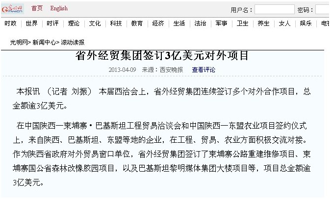 光明网转载:省外经贸集团签订3亿美元对外项目