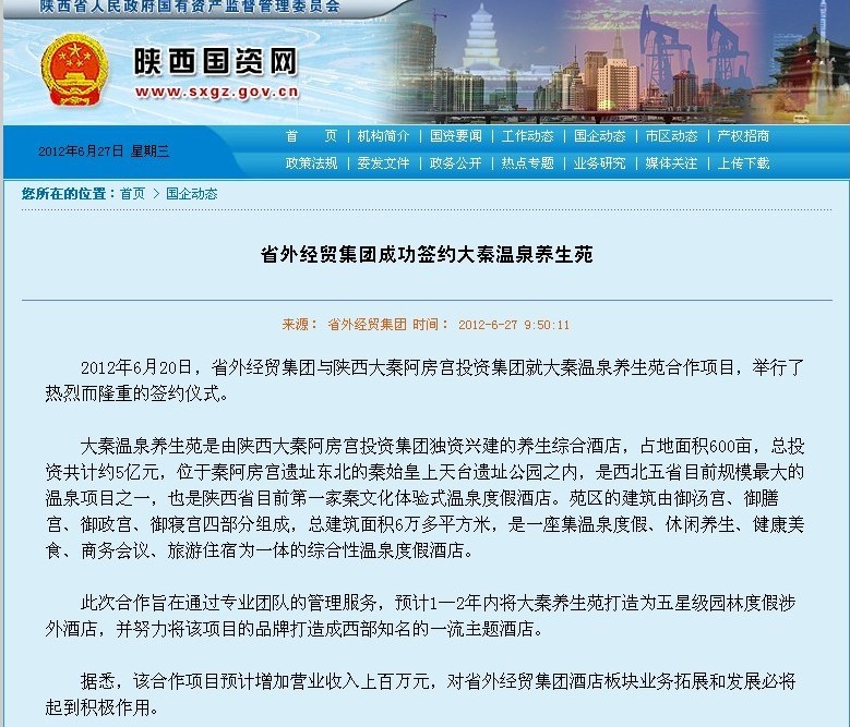省国资委网站登载:省外经贸集团成功签约大秦温泉养生苑