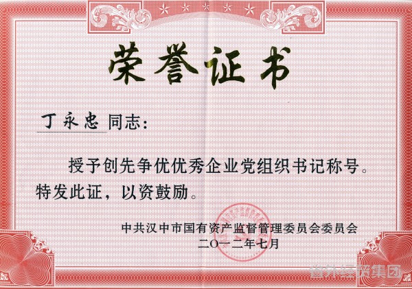 在建党91周年之际,集团所属汉中市建筑工程总公司党委书记、总经理丁永忠同志被汉中市国资委党委授予创先争优优秀企业党组织书记称号。