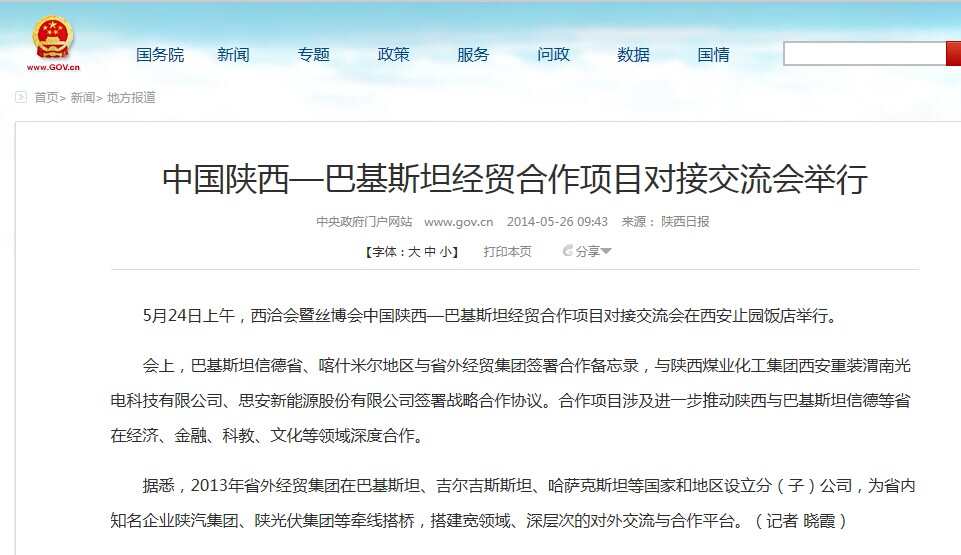 中央政府网站转载集团公司主办《中国陕西—巴基斯坦经贸合作项目对接交流会》情况