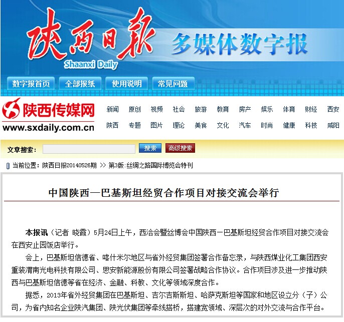 陕西日报刊登第十八届西洽会期间集团公司主办《中国陕西—巴基斯坦经贸合作项目对接交流会》情况