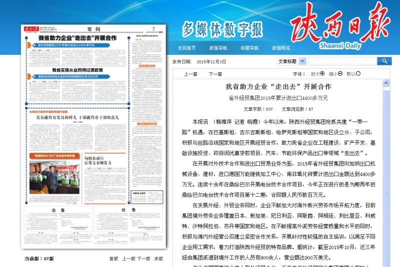 陕西日报刊登-----我省助力企业“走出去”开展合作