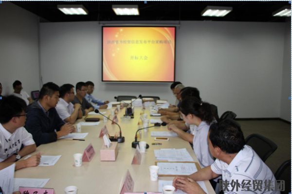陕西省外经贸综合服务有限公司关于陕西省外经贸信息发布平台采购项目开标大会于2017年6月8日上午9时10分在公司会议室正式举办。参与投标的企业有中软国际科技服务有限公司、西安未来国际信息股份有限公司、西安睿明信息科技有限公司、西安软通动力技术服务有限公司、陕西万德信息科技股份有限公司5家本地优质企业。