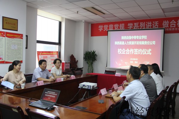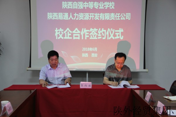 2018年6月21日上午,陕西自强中等专业学校(以下简称“自强中专”)、陕西易通人力资源开发有限责任公司(以下简称“易通人力”)校企合作签约仪式在易通人力501会议室举行。自强中专校长段瑞亭、副校长祁淑红、主任李乐,易通人力党委书记、董事长艾斌、总经理刘晓平、市场运营二部副总经理马勇、招聘培训部部长蔡文出席仪式。