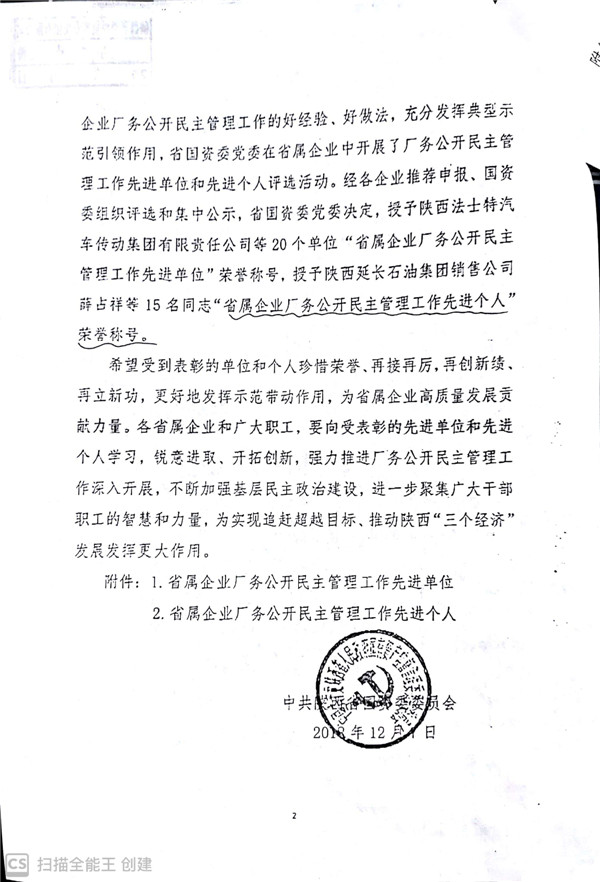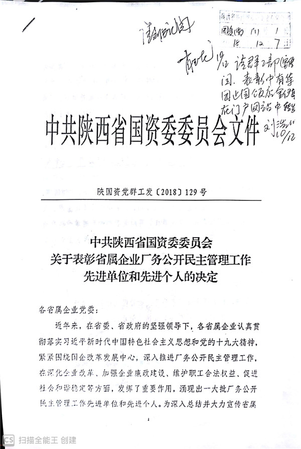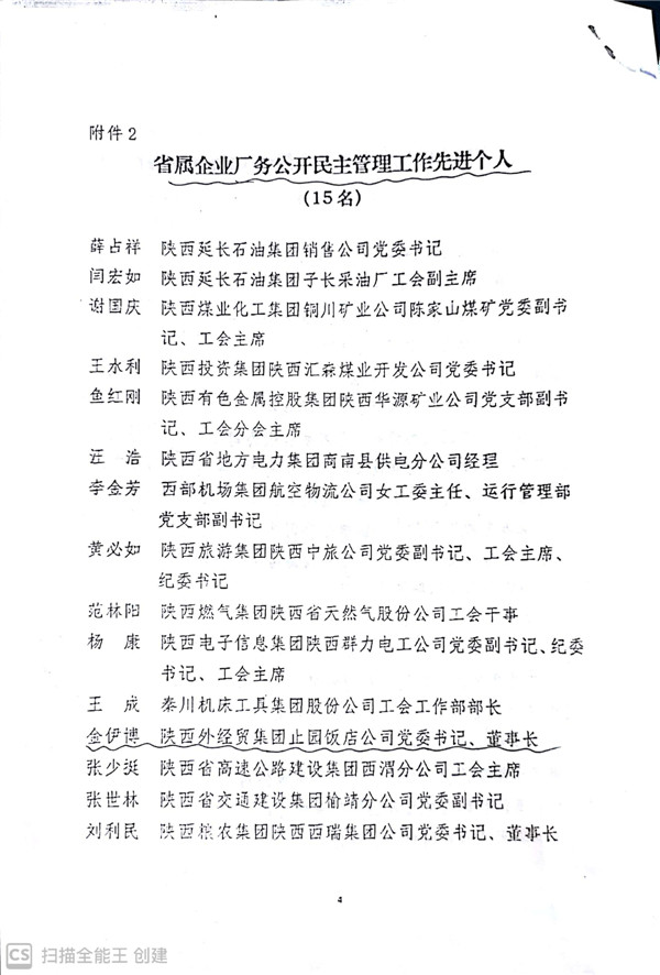 陕西省止园饭店有限责任公司党委书记、董事长金伊博获得省国资委系统“厂务公开民主管理工作先进个人”称号