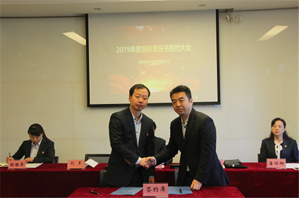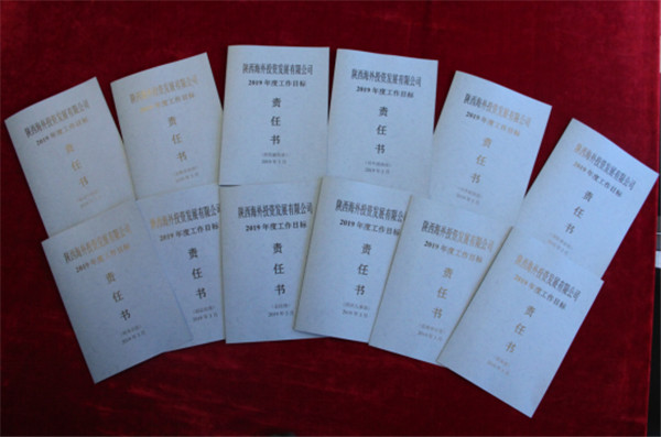 随后,大会进行了《2019年度目标责任书》的签约仪式,董事长丁永忠与总经理刘军、纪委书记韩雅萍,总经理刘军与副总经理杨浩、财务总监唐丽娜、各部门负责人分别签订了责任书。通过签订《2019年度目标责任书》,陕海投公司将陕外经贸集团部署的任务目标逐级分解落实到各个班子成员和各部门,进一步明确了任务目标,细化了工作举措,为陕海 投公司2019年重点工作任务的开展落实打下了坚实的基础。