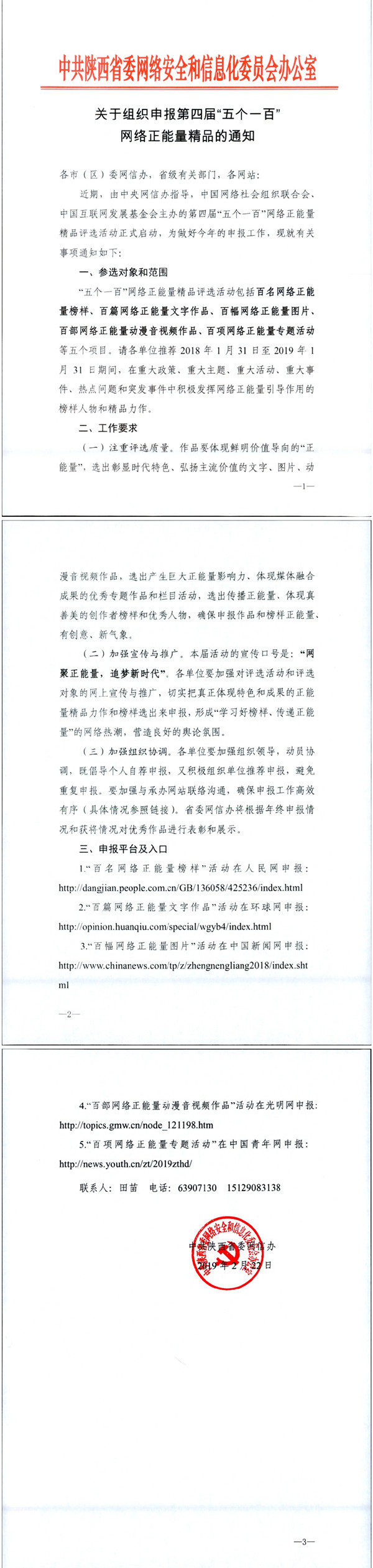 现将省委网信办《关于组织申报第四届“五个一百”网络正能量精品的通知》转发你们,请各单位结合实际,将申报材料报集团公司党委宣传部,统一进行申报。