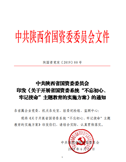 中共陕西省国资委委员会印发《关于开展省国资委系统“不忘初心、牢记使命”主题教育的实施方案》的通知