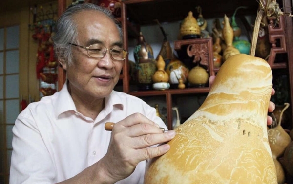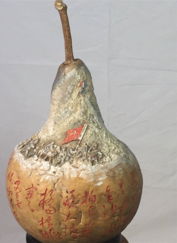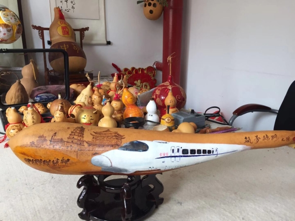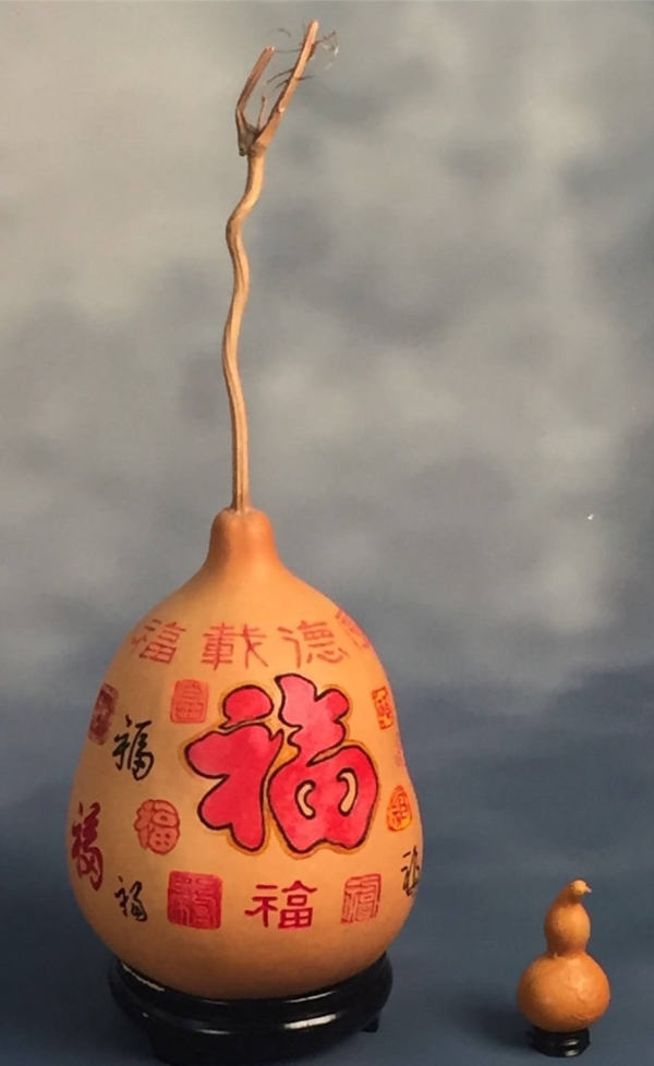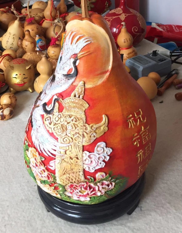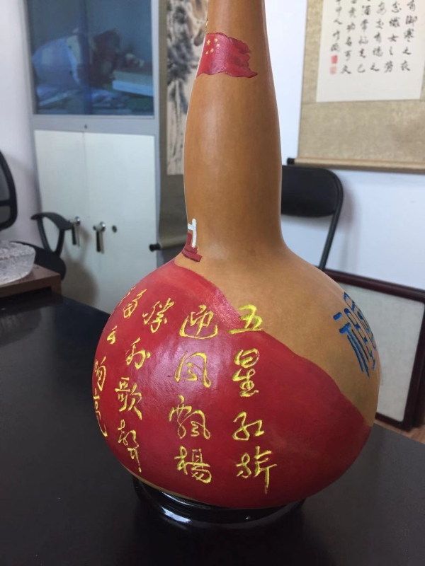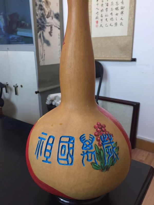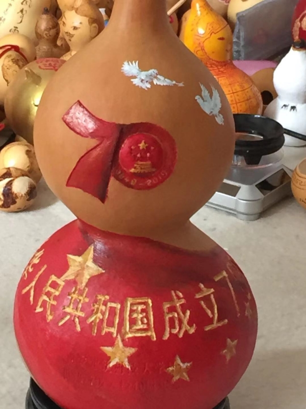 在喜迎新中国成立70周年日子里,梁平安把对祖国的祝福在葫芦上表现出来,祝祖国繁荣富强,人民幸福安康。